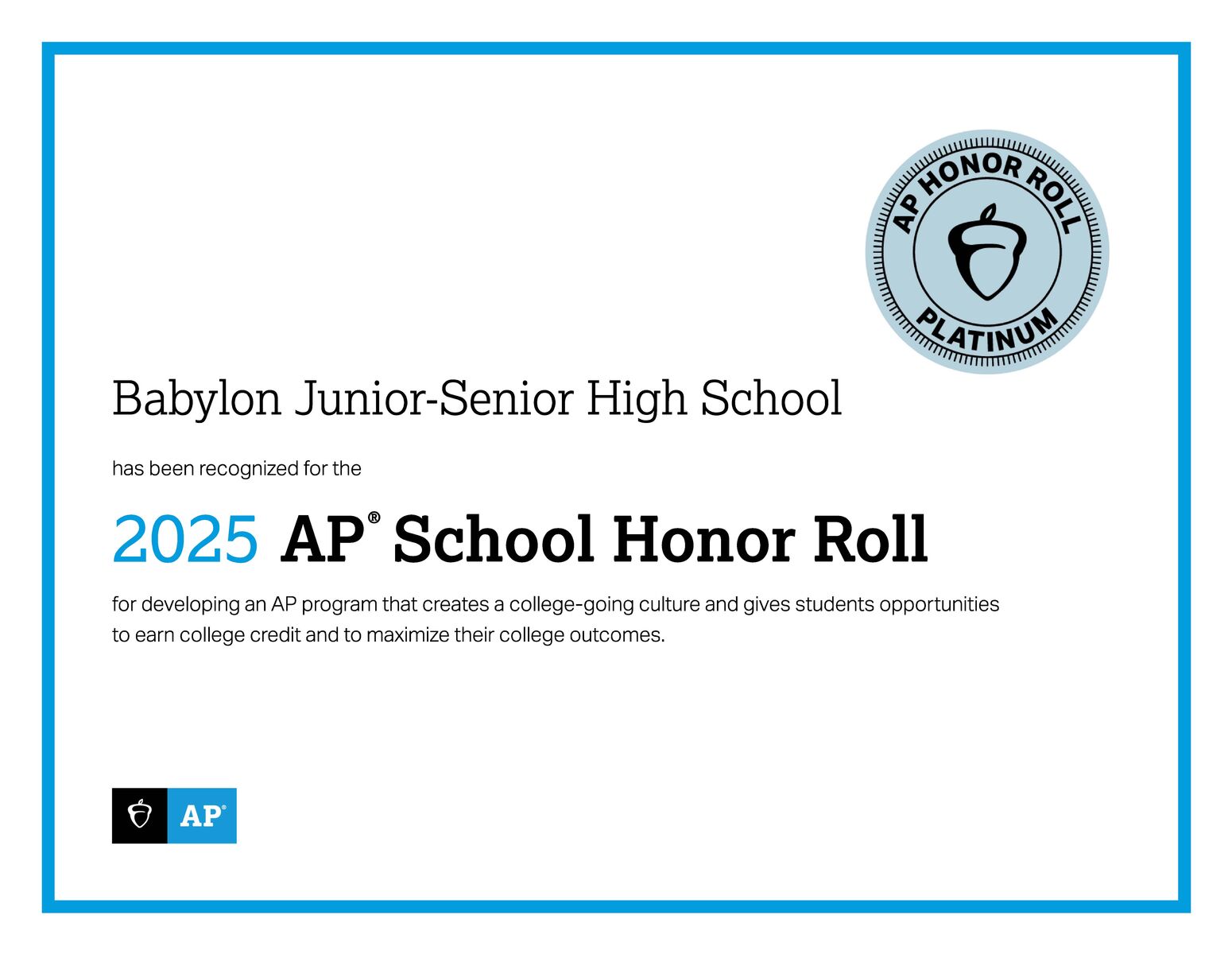 Babylon Junior-Senior High School has earned the Platinum distinction on the College Board's 2025 AP School Honor Roll, the program's highest level of recognition. This achievement marks the school...