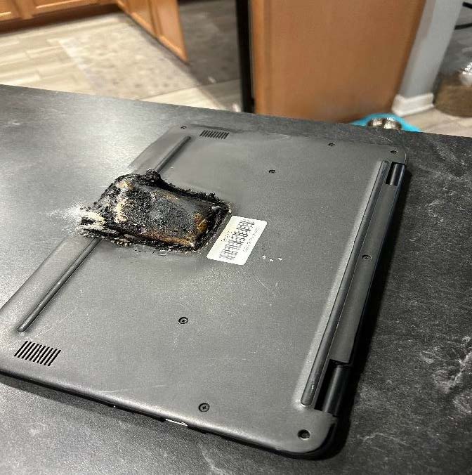 A student in a member district was charging a mobile device at home on a couch cushion when a family member smelled smoke. The Lithium-Ion battery had failed, caught fire and burned the couch fabric and cushion, which thankfully was treated with flame retardant, avoiding what could have been a bigger tragic event.